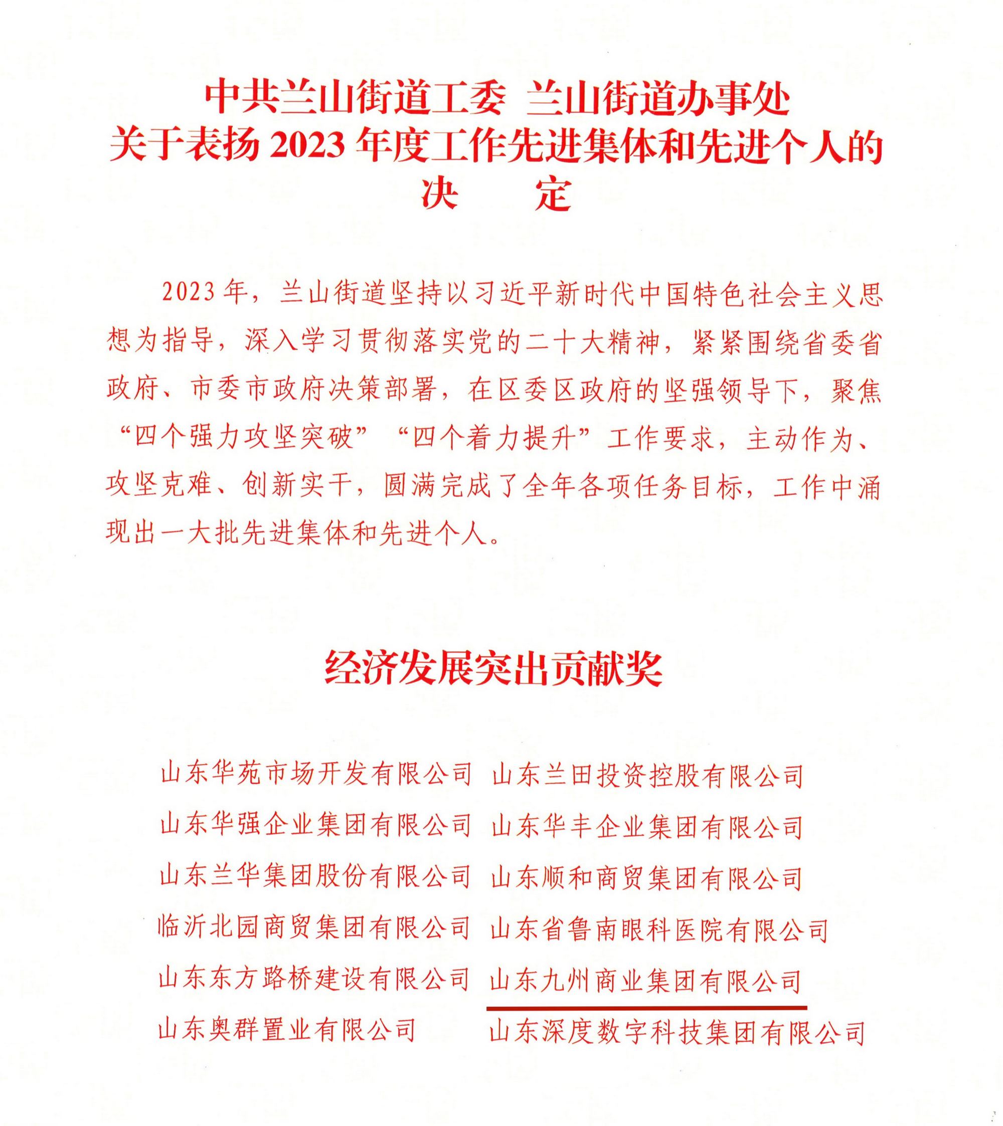 1月20日上午,蘭山街道召開2023年度工作總結(jié)表彰會(huì)議。會(huì)上,宣讀了《中共蘭山街道工委 蘭山街道辦事處關(guān)于表揚(yáng)2023年度工作先進(jìn)集體和先進(jìn)個(gè)人的決定》,集團(tuán)榮獲蘭山街道“經(jīng)濟(jì)發(fā)展突出貢獻(xiàn)獎(jiǎng)”。