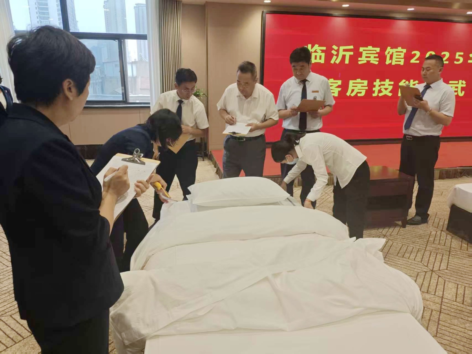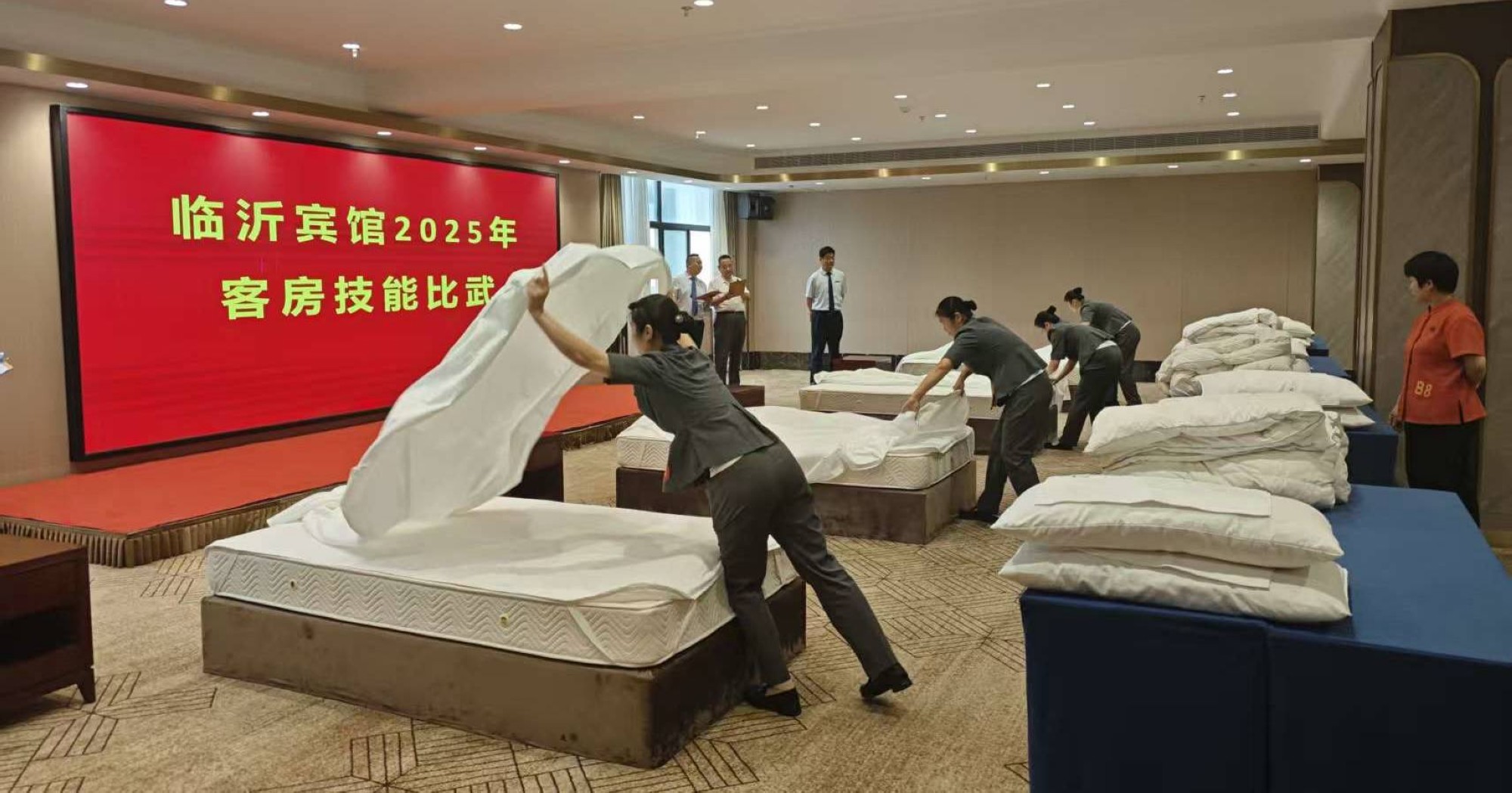 9月28日下午,臨沂賓館中式鋪床技能比武在沂蒙路店貴賓樓多功能廳舉行。本次技能比武分為中式鋪床、開夜床兩項(xiàng),共有18名選手參加,以實(shí)操比拼展現(xiàn)服務(wù)專業(yè)素養(yǎng)。
