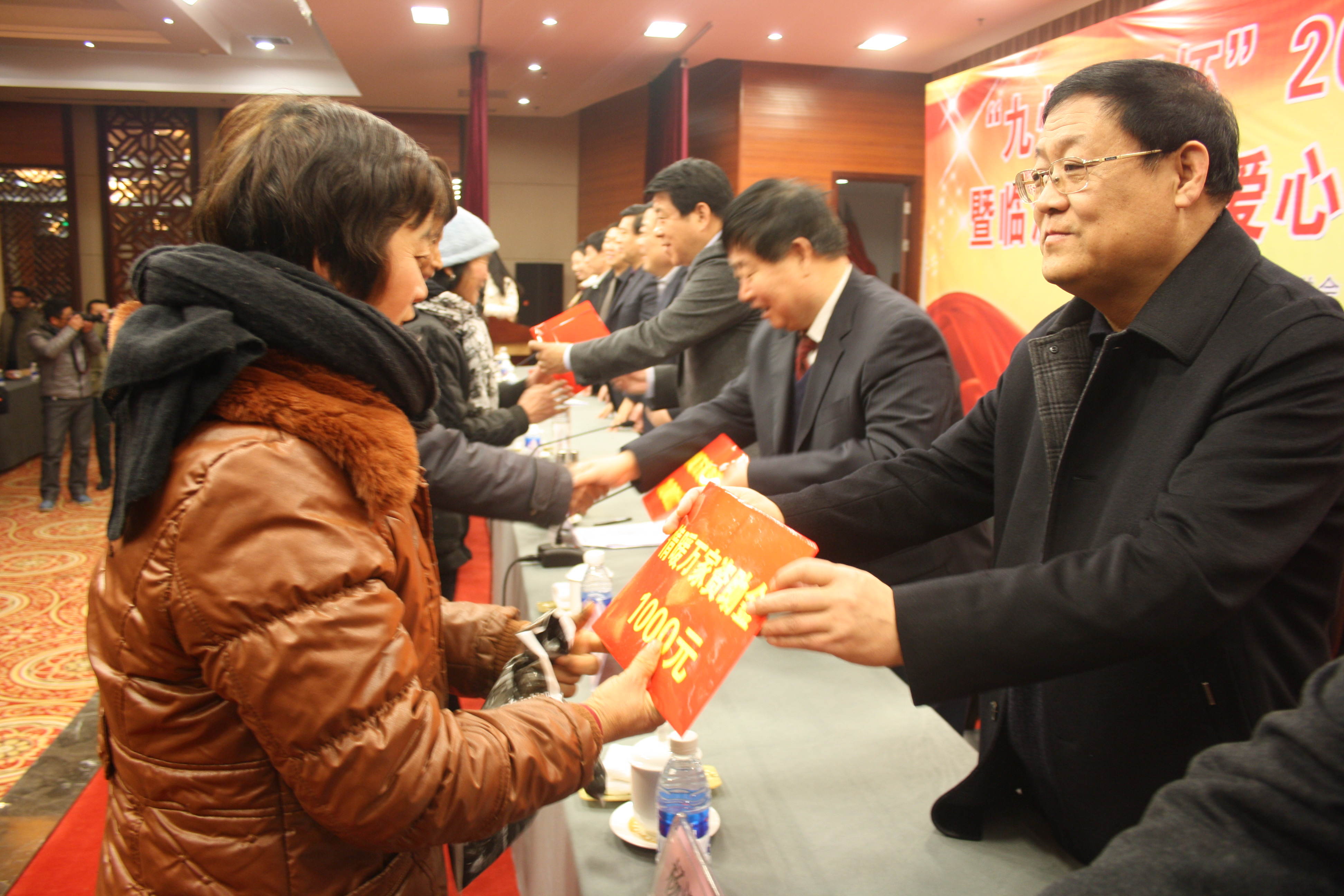 1月10日,“九州集團(tuán)杯”情暖萬(wàn)家啟動(dòng)儀式在臨沂賓館舉行。市慈善總會(huì)會(huì)長(zhǎng)張聞?dòng)畹阮I(lǐng)導(dǎo)出席啟動(dòng)儀式。集團(tuán)董事長(zhǎng)楊沂城,黨委書記王佐文等現(xiàn)場(chǎng)為全市100名困難群眾發(fā)放慰問金。 活動(dòng)現(xiàn)場(chǎng),舉行了慈善慰問金轉(zhuǎn)交儀式,集團(tuán)董事長(zhǎng)楊沂城代表集團(tuán)將九州慈善慰問金轉(zhuǎn)交給市慈善總會(huì)。黨委書記王佐文代表集團(tuán)在儀式上講話。100名受助群眾依次走到前面現(xiàn)場(chǎng)領(lǐng)取慰問金。春節(jié)來(lái)臨之際,集團(tuán)再次為全市困難群眾發(fā)放慰問金,幫助他們解決實(shí)際問題,確保過(guò)一個(gè)快樂、祥和的節(jié)日。 “情暖萬(wàn)家”、“朝陽(yáng)助學(xué)”、“夕陽(yáng)扶老”、“康復(fù)助醫(yī)”、“愛心助殘”……近年來(lái),九州集團(tuán)在市慈善總會(huì)的大力支持下開展了一項(xiàng)項(xiàng)溫暖而惠及全市困難群體的救助工程,惠及了全市眾多困難群體,為推動(dòng)我市慈善事業(yè)的發(fā)展作出了應(yīng)有貢獻(xiàn)。