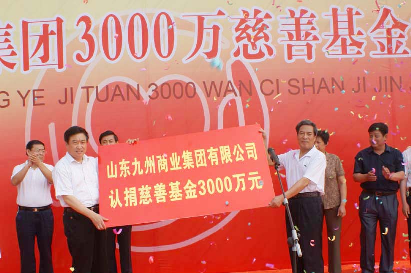 6月5日,臨沂市慈善總會(huì)為集團(tuán)舉行了“山東九州商業(yè)集團(tuán)3000萬(wàn)慈善基金捐贈(zèng)儀式”。臨沂市慈善總會(huì)會(huì)長(zhǎng)、市政府副市長(zhǎng)左沛廷,慈善總會(huì)常務(wù)副會(huì)長(zhǎng)、民政局長(zhǎng)姜新利,慈善總會(huì)副會(huì)長(zhǎng)、集團(tuán)董事長(zhǎng)楊本渠,慈善總會(huì)副會(huì)長(zhǎng)兼秘書(shū)長(zhǎng)、民政局副局長(zhǎng)朱步君,以及集團(tuán)領(lǐng)導(dǎo)副董事長(zhǎng)兼黨委書(shū)記張素芬、總經(jīng)理?xiàng)钜食、黨委副書(shū)記王佐文等出席捐贈(zèng)儀式。 此次認(rèn)捐3000萬(wàn)元慈善基金,是集團(tuán)在去年向市慈善總會(huì)認(rèn)捐200萬(wàn)元,設(shè)立“九州慈善基金”的基礎(chǔ)上追加的。隨著追加額度的增加,救助范圍也逐步的擴(kuò)大,從去年的用于助學(xué)擴(kuò)大到走訪困難群眾和其它全市慈善救助項(xiàng)目。多年來(lái),集團(tuán)在自身不斷發(fā)展壯大的同時(shí),牢記報(bào)效國(guó)家、回饋社會(huì)、投身公益的使命,積極參與各類助學(xué)、助殘、救災(zāi)、濟(jì)困等公益活動(dòng)。集團(tuán)累計(jì)捐款捐物達(dá)數(shù)百萬(wàn)元,尤其去年四川大地震后,集團(tuán)全體干部職工心系災(zāi)區(qū),捐款捐物100余萬(wàn)元,受到社會(huì)各界的一致好評(píng)。今年5月9日集團(tuán)被評(píng)為臨沂市首屆“十大慈善單位”。九州人用大愛(ài)譜寫(xiě)了一曲曲獻(xiàn)身慈善事業(yè)的壯美樂(lè)章。 慈善事業(yè)是一項(xiàng)崇高而光榮的事業(yè),開(kāi)展慈善捐助、幫助弱勢(shì)群體,對(duì)促進(jìn)社會(huì)進(jìn)步,構(gòu)建和諧社會(huì)具有重要而深遠(yuǎn)的意義。隨著企業(yè)的發(fā)展,集團(tuán)將進(jìn)一步投入到慈善事業(yè)中去,為推動(dòng)我市慈善事業(yè)的發(fā)展和構(gòu)建和諧社會(huì)貢獻(xiàn)自己的一份力量。
