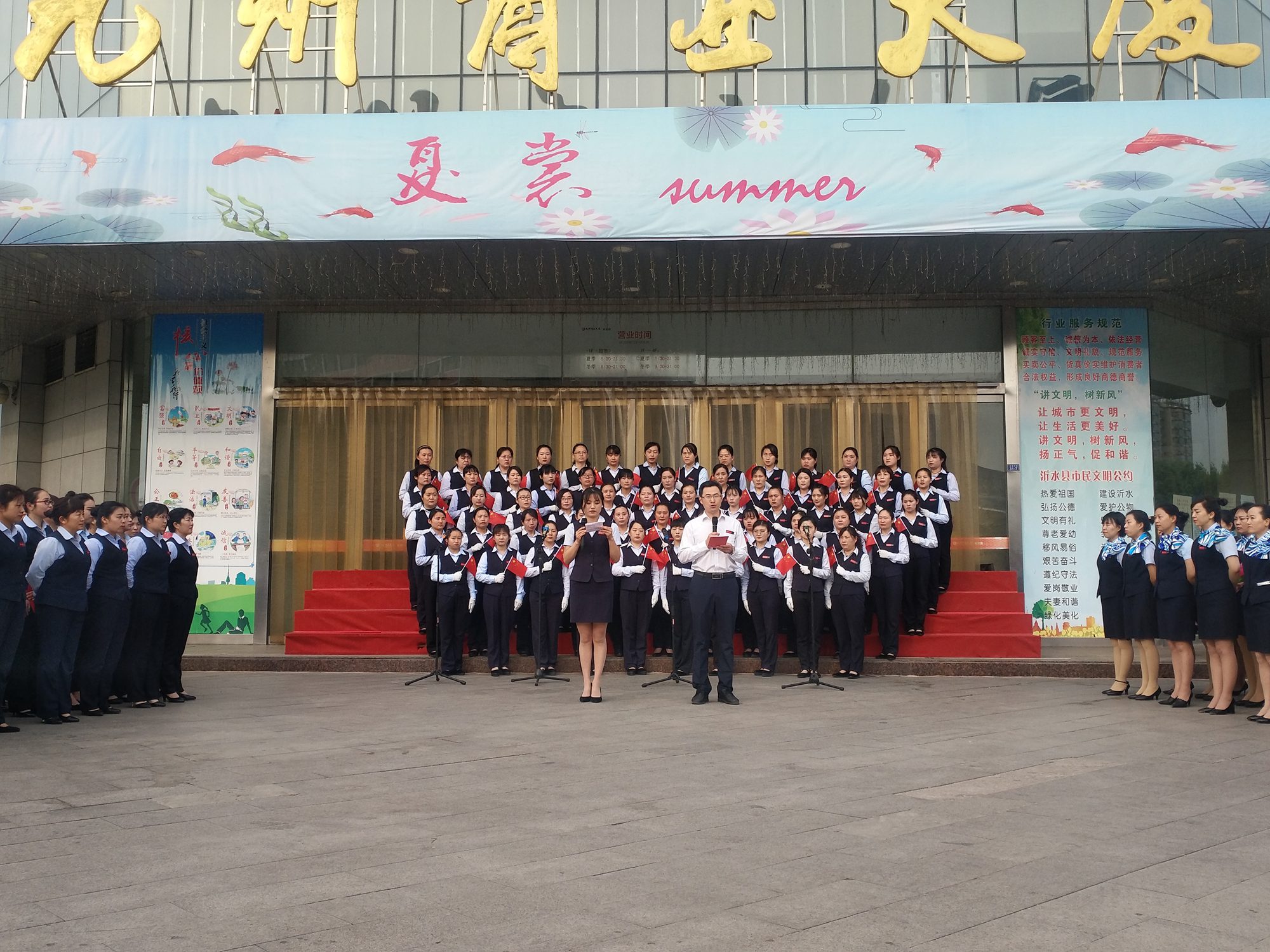 54日早上,大廈沂水區(qū)域門店在長(zhǎng)安店門前廣場(chǎng)舉行了慶“五四”合唱比賽活動(dòng)。