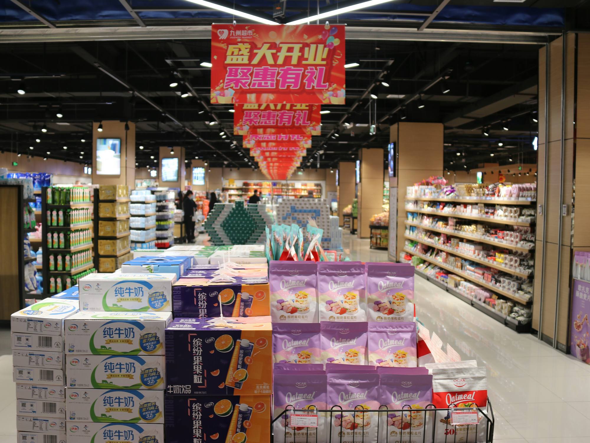 九州超市解放路店位于九州家電解放路店負一樓,經(jīng)營面積3600多平方米,經(jīng)營品類涉及煙酒、休閑食品、生鮮果蔬、鮮肉水產(chǎn)、乳品飲料、日化百貨等。在開業(yè)籌備期間,公司各部門上下齊心,各司其職,各項工作穩(wěn)步推進,保障了門店順利開業(yè)。