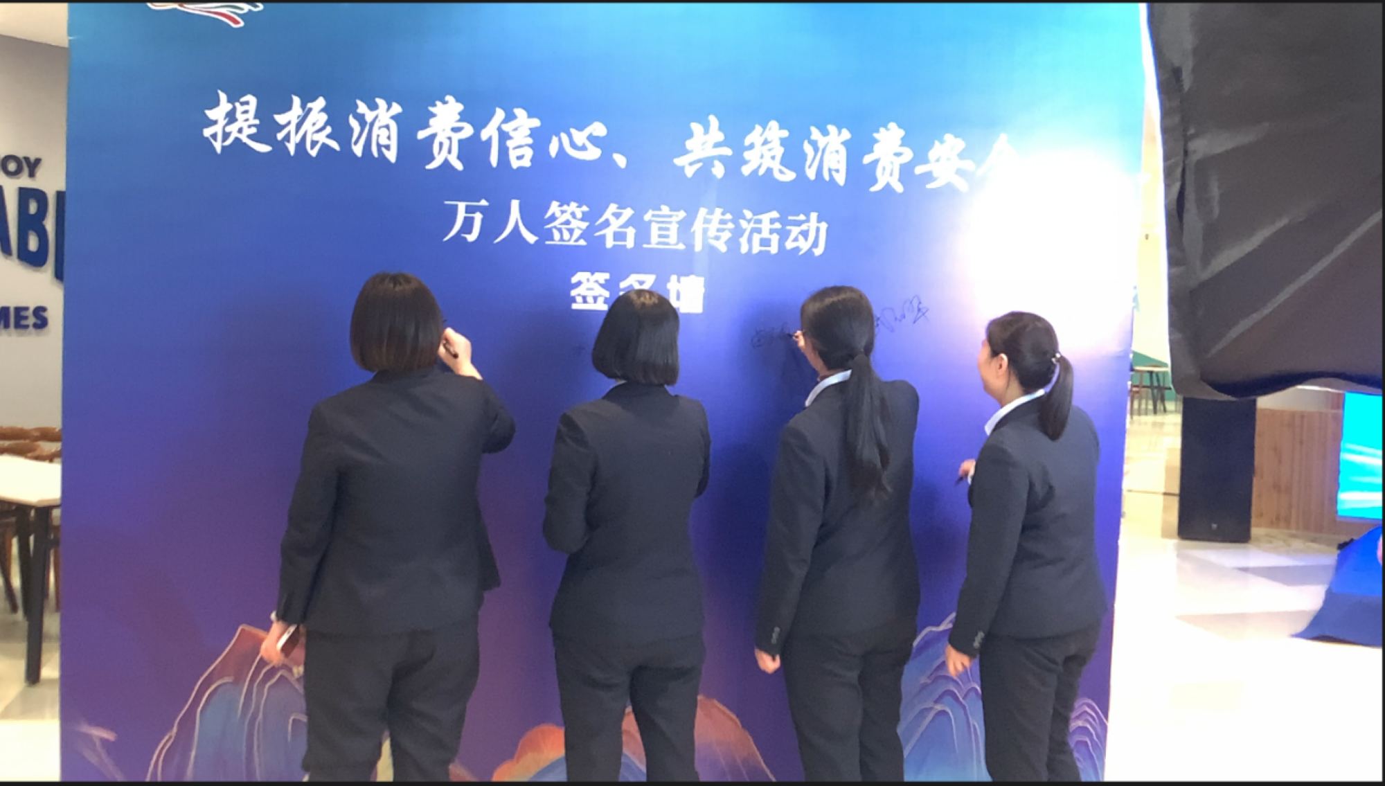 活動中,九州商業(yè)大廈解放路店組織員工代表在六樓商場觀看了主會場的宣傳活動情況,同時連線主會場進(jìn)行集體承諾發(fā)言,活動結(jié)束后大家移步到簽名墻進(jìn)行簽名。