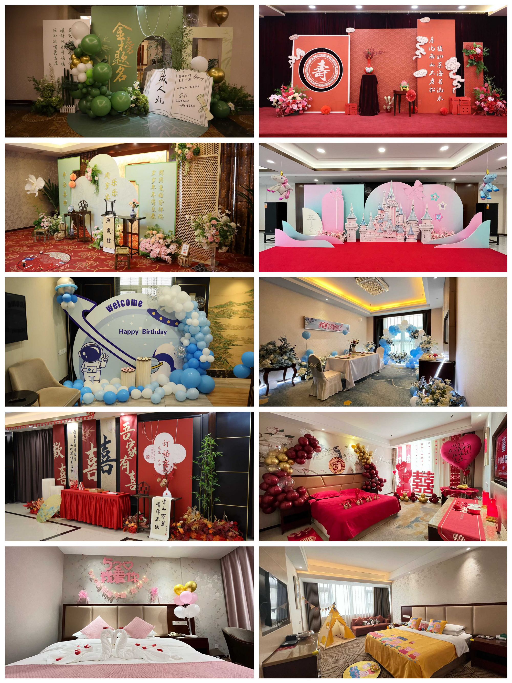 比賽中,各部位根據(jù)房型、宴會類型等設計出了不同場景布置主題。在客房場景上分別設計布置了滿足家庭出游需要的“陽光親子房”,浪漫、溫馨、喜慶的“鐘愛一生”發(fā)嫁房,充滿愛意的“傾城之戀”“鐘愛一生”情侶房。在用餐場景上分別以寶寶周歲、兒童生日為切入點設計了“掌中寶”和“未來可期”主題包間場景;以寶寶宴、壽宴為思路打造了“夢幻城堡”“松鶴延年”主題宴會廳布置;并制作了適用于升學、定親場景的“金榜題名”“永結(jié)同心”主題布置。在設計上參賽選手巧妙地融合了國潮風、卡通風等不同元素,呈現(xiàn)出一個個富有創(chuàng)意且充滿個性化的場景布置,場景布置充分體現(xiàn)實用性和美觀性。