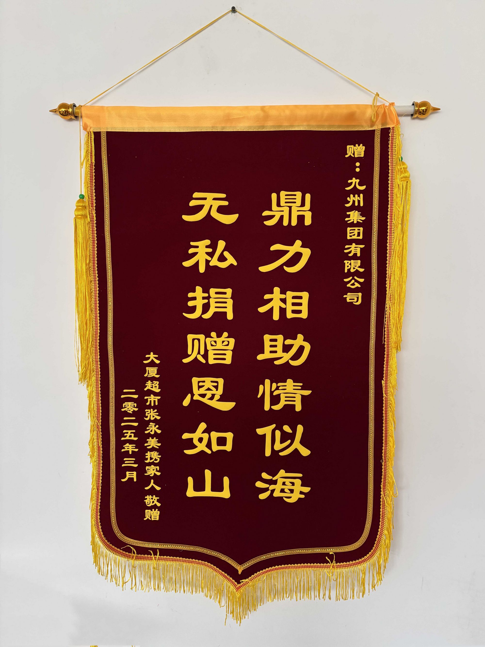 3月6日上午,一面寫有“鼎力相助情似海,無私捐贈恩如山”的錦旗及一封感謝信送到了九州集團,為這個忙碌的工作日增添了一抹溫馨色彩。