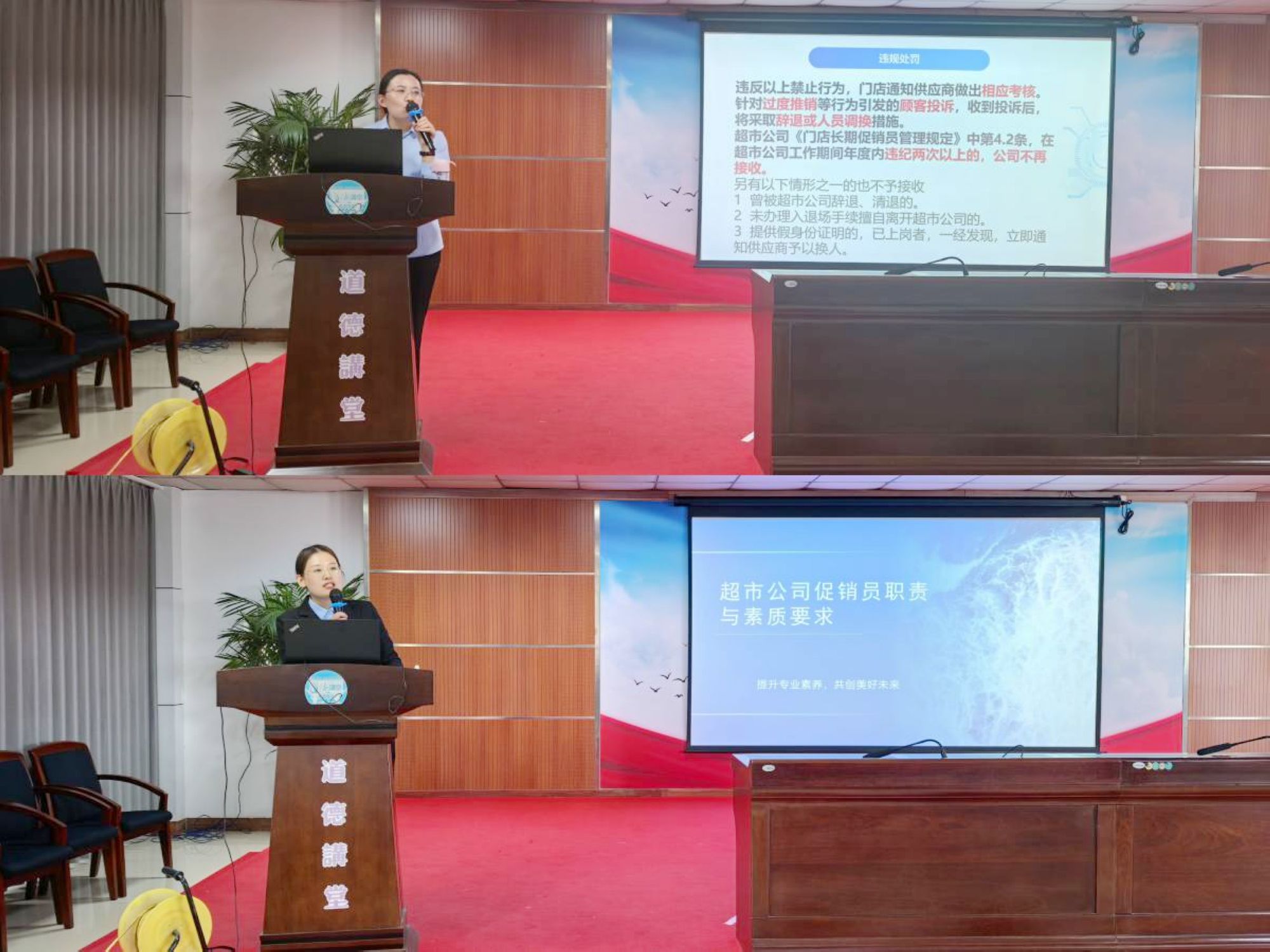 本次培訓由購物中心河東店助理張玉霞、購物中心齊魯園店助理李建梅擔任主講師,重點圍繞九州企業(yè)文化宣貫、促銷員職責與技能、禮儀素養(yǎng)與服務規(guī)范等方面展開。培訓過程中,講師結(jié)合賣場真實案例,生動形象地講解了促銷員在工作過程中的行為規(guī)范。