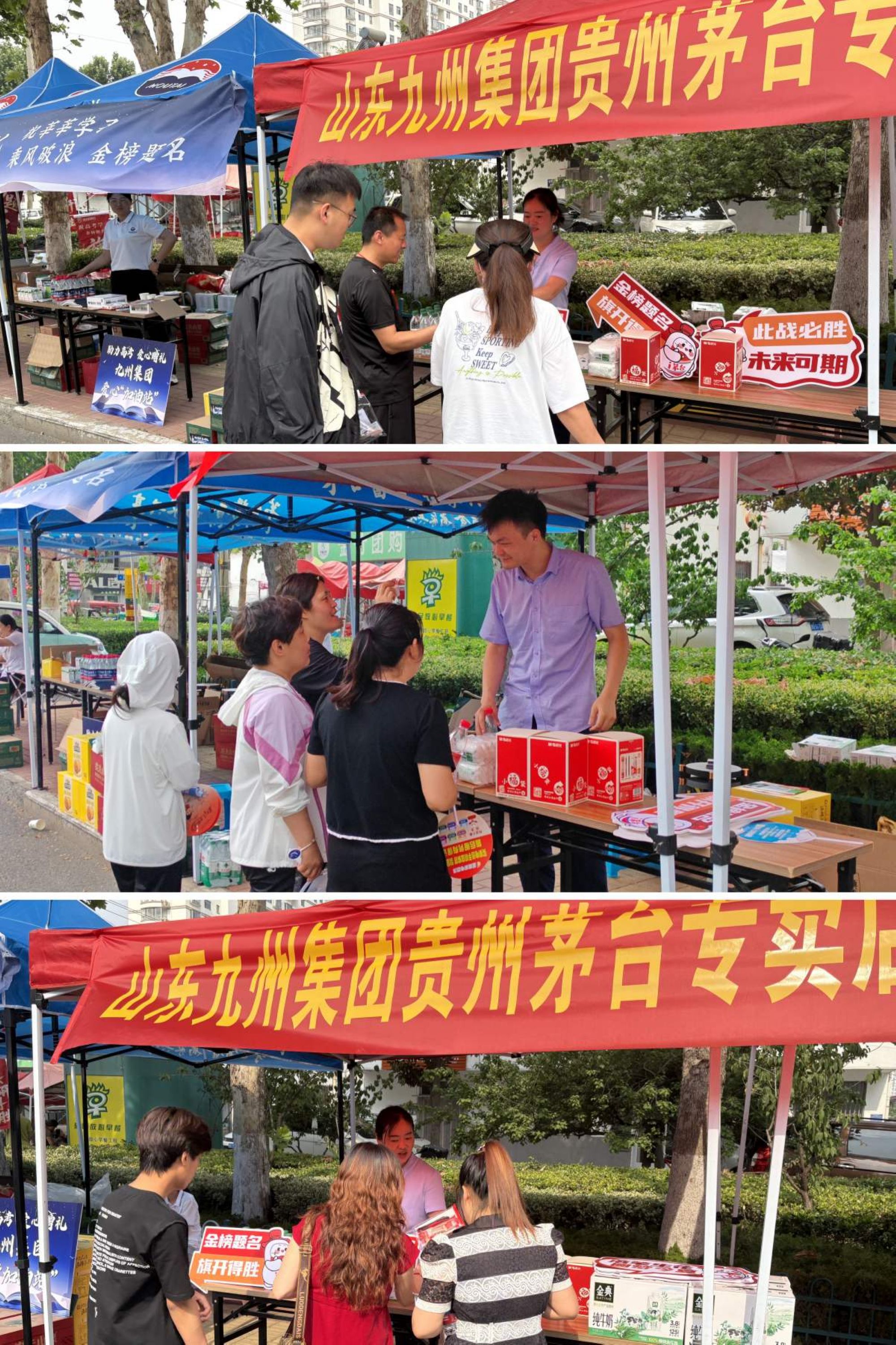 超市公司青年志愿者們來(lái)到臨沂市第二十七中學(xué)考點(diǎn)外,搭起帳篷,為考生和家長(zhǎng)準(zhǔn)備了礦泉水、牛奶、濕巾、文具套裝等助考用品,為等候的家長(zhǎng)提供一份清涼。