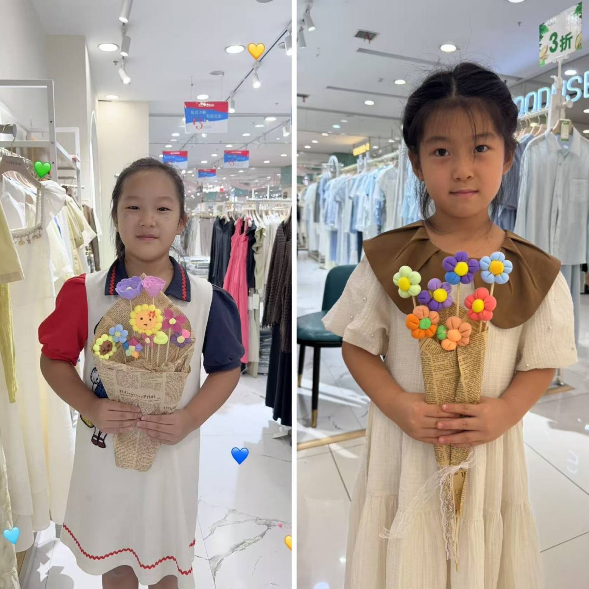 活動現(xiàn)場, CGFUSHI 女裝店長孫良梅化身 “藝術(shù)導(dǎo)師”,從基礎(chǔ)花瓣揉制到花莖拼接技巧,再到花葉搭配與整體包裝, 逐步拆解粘土花束的制作要點。到場家長與孩子攜手協(xié)作,揉、捏、粘、貼間,原本普通的粘土逐漸蛻變,一朵朵 “永不凋謝”的粘土花朵在親子默契配合下成型,組合為獨具心意的花束,猶如孩子們的臉龐,燦爛又美麗。
