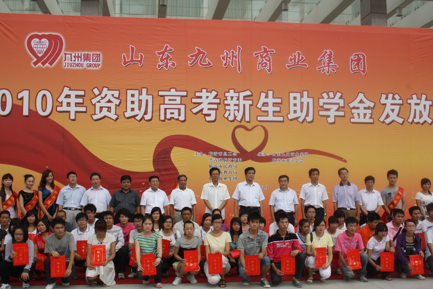 8月31日上午,山東九州商業(yè)集團2010年資助高考新生助學金發(fā)放儀式在臨沂賓館商城店舉行。儀式上,66名品學兼優(yōu)的特困新生每人獲得了4000元的助學金。市人大常委會副主任、市慈善總會名譽會長李寶智,市政府副秘書長、市慈善總會副會長張凡春,市紀委派駐五組書記王言卓,市民政局副局長、市慈善總會副會長朱步君,市總工會副主席陳愛平,共青團臨沂市委副書記俞陽,市慈善總會副會長、原集團董事長楊本渠,集團董事長楊沂城,集團黨委書記王佐文,市慈善總會辦公室主任李長征,市教育局學生資助中心主任陳磊等出席發(fā)放儀式。 這是集團連續(xù)三年向高考特困新生發(fā)放助學金。三年來,集團幫助近百名高考新生順利走進了大學校門,在學校里許多受資助的學生紛紛來信表達感激之情。集團積極投身慈善事業(yè),勇于承擔社會責任,得到了上級領導和社會各界的一致好評,被授予“臨沂市十大愛心企業(yè)”、“臨沂市首屆十大慈善單位”等榮譽稱號。