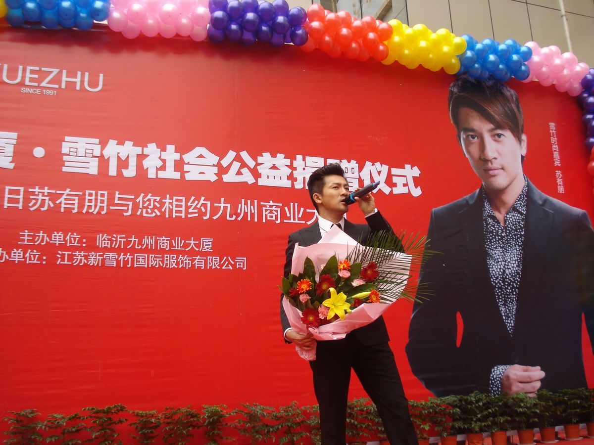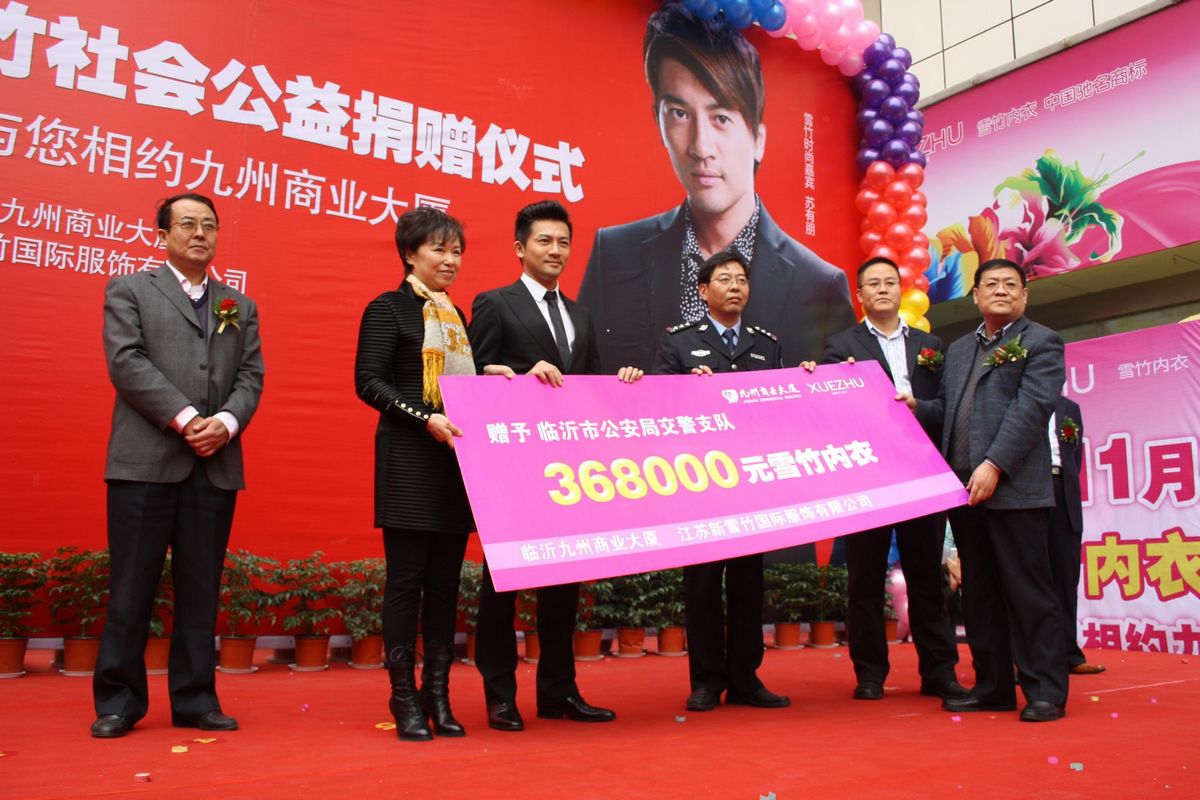 1113,九州商業(yè)大廈攜手江蘇新雪竹國際服飾有限公司共同舉辦了“雪竹2010風(fēng)尚中國”社會公益捐贈儀式,向我市交警捐贈了價值36.8萬元的雪竹內(nèi)衣。臺灣藝人、前小虎隊成員蘇有朋參加了捐贈儀式。