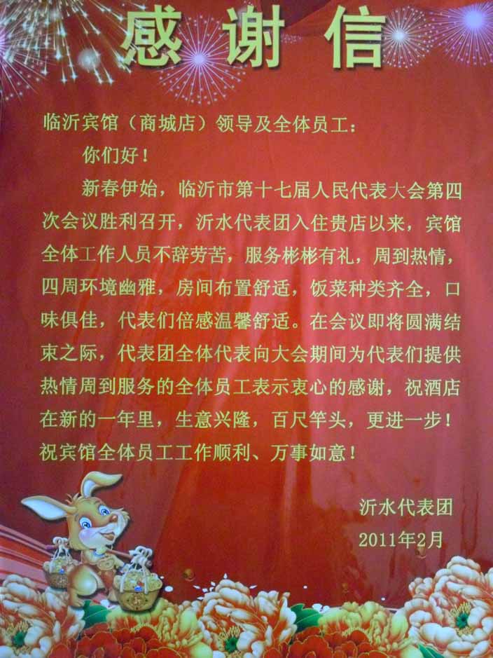 2月20日——25日臨沂賓館兩會(huì)接待期間,優(yōu)質(zhì)細(xì)微的服務(wù)得到了與會(huì)代表的肯定和好評(píng),并收到了代表團(tuán)大量的感謝信、表揚(yáng)信,下面是其中的一部分: