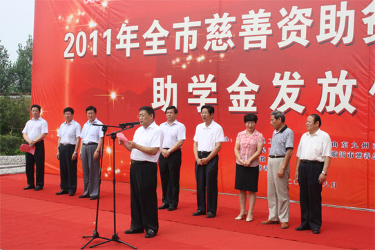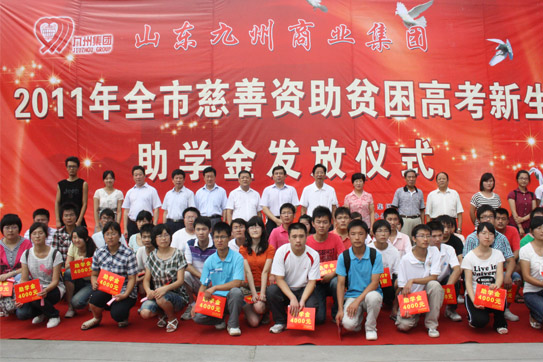 8月12日,2011年度山東九州商業(yè)集團資助貧困高考新生助學金發(fā)放儀式在臨沂賓館大學酒店舉行。50名在今年高考中取得優(yōu)異成績的貧困新生每人領(lǐng)到了4000元九州慈善助學金。市委常委、市總工會主席林祥余、市政協(xié)副主席趙愛華、市人大常委會法工委主任殷洪舉、市民政局局長姜新利、市紀委派駐五組副書記王培成、市慈善總會副會長楊本渠、集團董事長楊沂城、集團黨委書記王佐文等出席儀式。